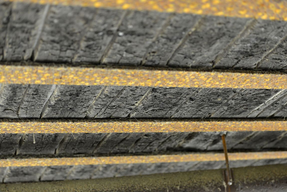 The wood planks in the roof show the signs of the fire